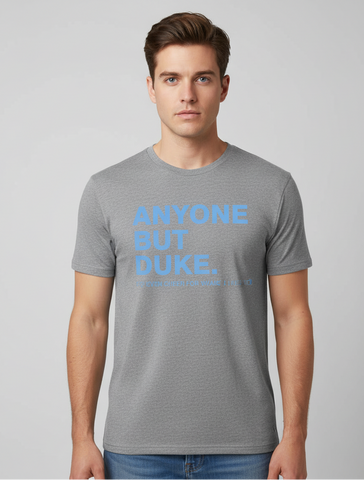 Embrace the rivalry with the Anyone But Duke T-Shirt! This witty tee playfully expresses your allegiance, making it clear who you’re rooting against. Available in Carolina Blue, Navy, and Heather Gray, this shirt is crafted from comfortable, durable fabric that’s perfect for game days, campus strolls, or just showing off your Tar Heel spirit. Wear it proudly and let your stance be known with this bold, fan-favorite design. Add the Anyone But Duke T-Shirt to your collection and let your UNC pride shine!