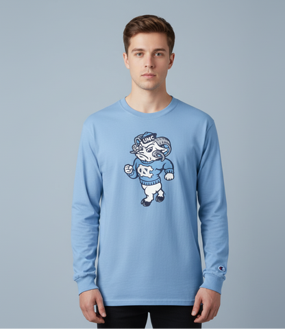 Celebrate Tar Heel pride with the Rameses Long Sleeve Shirt. Crafted for enduring comfort and style, this shirt features the iconic Ramses design. Whether you're at a game, on campus, or anywhere else, this long-sleeve tee is a perfect addition to your wardrobe. Show your dedication to the team in timeless fashion – get your Champion Ramses Long-Sleeve T-Shirt now and proudly represent UNC with every wear!