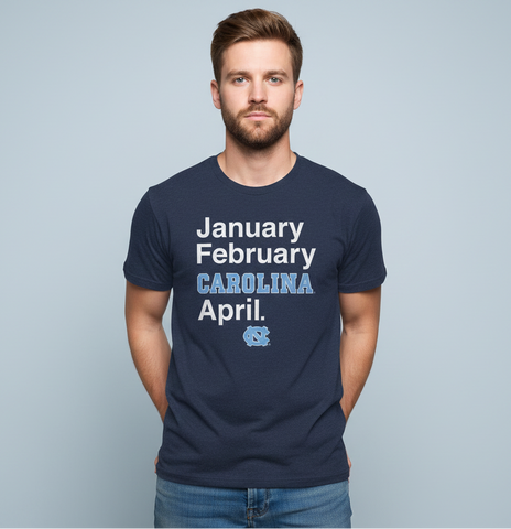 The January February Carolina April T-Shirt combines a clever and playful design with a nod to UNC's legendary basketball heritage. Featuring the months "January," "February," and "April," the shirt celebrates the Tar Heels' success and dominance during basketball season. The word "Carolina" is prominently displayed, reinforcing the pride and passion associated with UNC basketball. This fun and unique tee is perfect for any true Tar Heels fan looking to showcase their team spirit all year long!